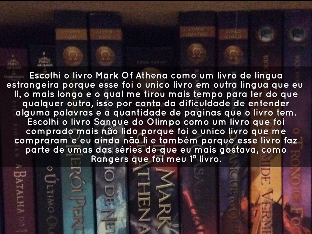 Escolhi o livro Mark Of Athena como um livro de lingua estrangeira porque esse foi o unico livro em outra lingua que eu li, o mais longo e o qual me tirou mais tempo para ler do que qualquer outro, isso por conta da dificuldade de entender alguma palavras e a quantidade de paginas que o livro tem.