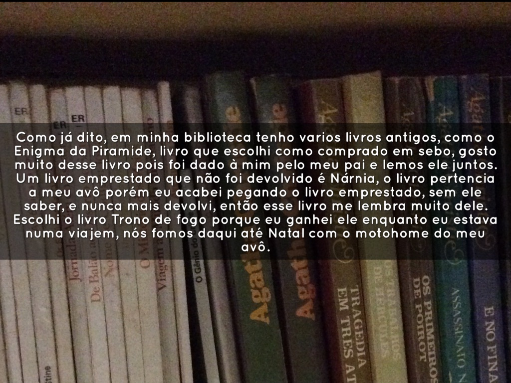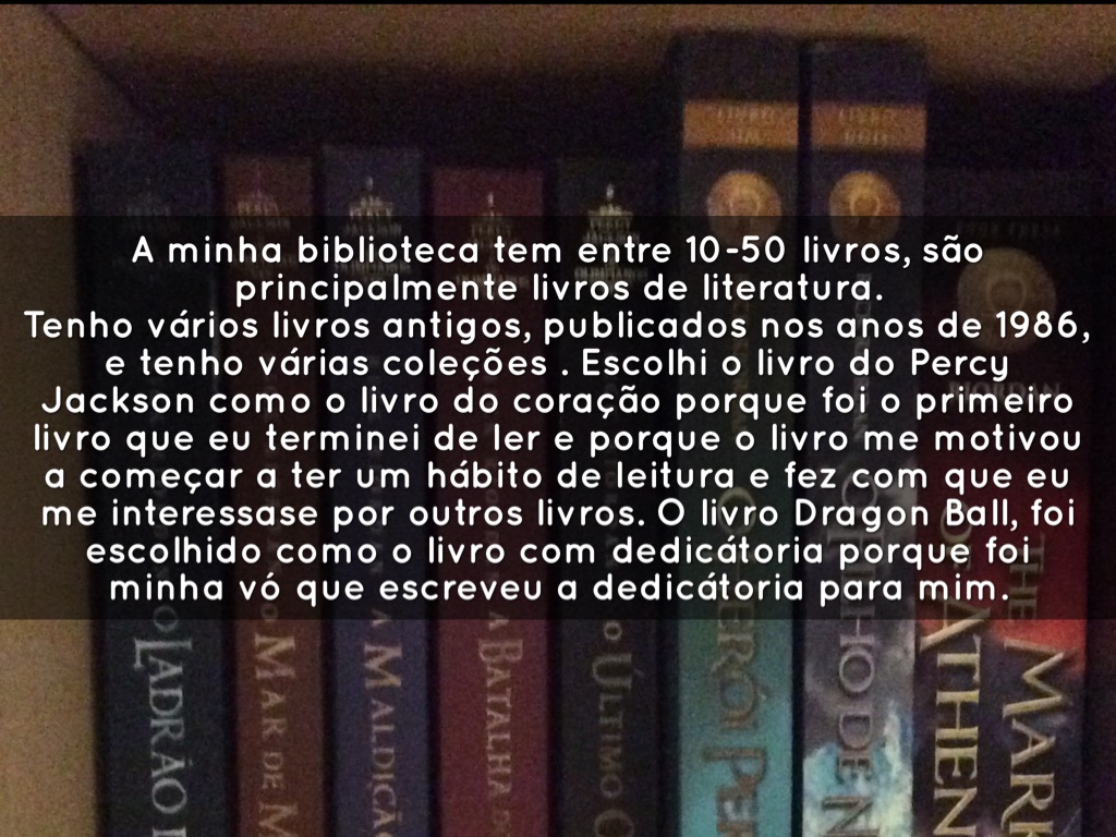 Tenho vários livros antigos, publicados nos anos de 1986, e tenho várias coleções . Escolhi o livro do Percy Jackson como o livro do coração porque foi o primeiro livro que eu terminei de ler e porque o livro me motivou a começar a ter um hábito de leitura e fez com que eu me interessase por outros livros. O livro Dragon Ball, foi escolhido como o livro com dedicátoria porque foi minha vó que escreveu a dedicátoria para mim.