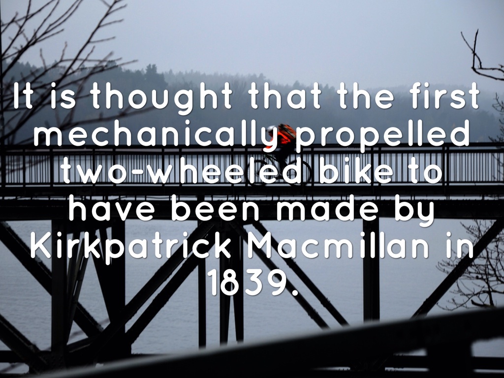 It is thought that the first mechanically propelled two-wheeled bike to have been made by Kirkpatrick Macmillan in 1839.