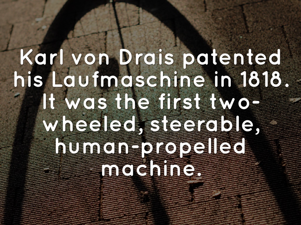 Karl von Drais patented his Laufmaschine in 1818. It was the first two-wheeled, steerable, human-propelled machine.