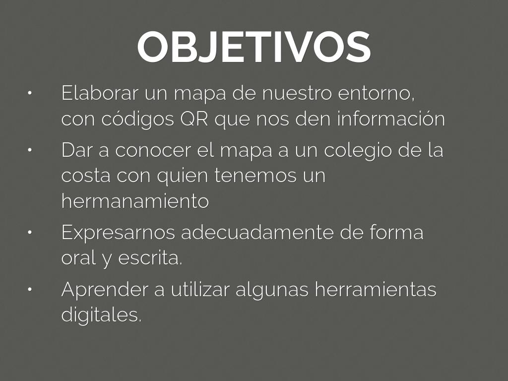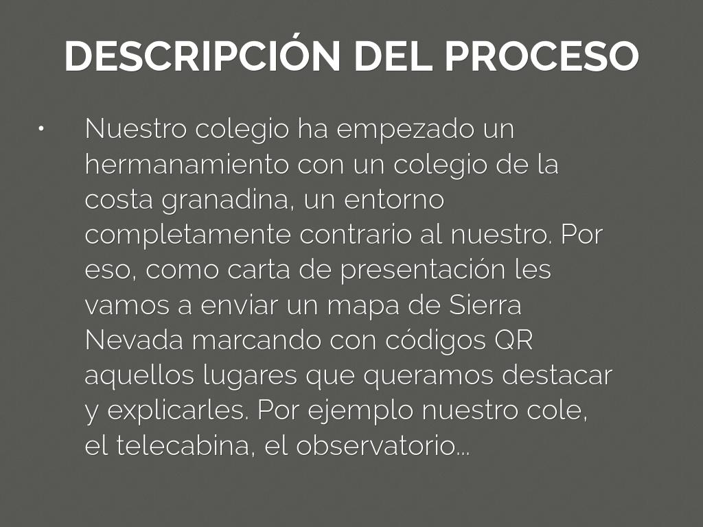 Nuestro colegio ha empezado un hermanamiento con un colegio de la costa granadina, un entorno completamente contrario al nuestro. Por eso, como carta de presentación les vamos a enviar un mapa de Sierra Nevada marcando con códigos QR aquellos lugares que queramos destacar y explicarles. Por ejemplo nuestro cole, el telecabina, el observatorio...