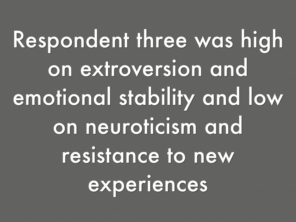 Respondent three was high on extroversion and emotional stability and low on neuroticism and resistance to new experiences