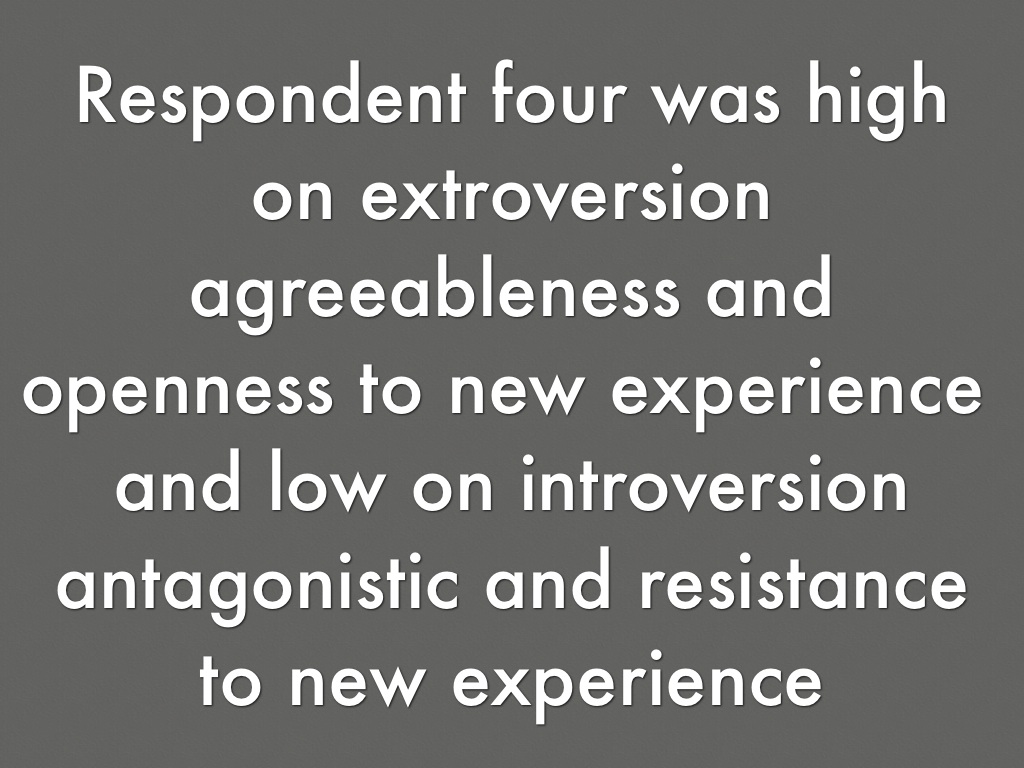 Respondent four was high on extroversion agreeableness and openness to new experience and low on introversion antagonistic and resistance to new experience