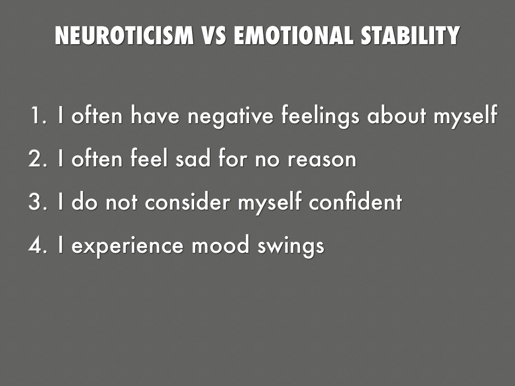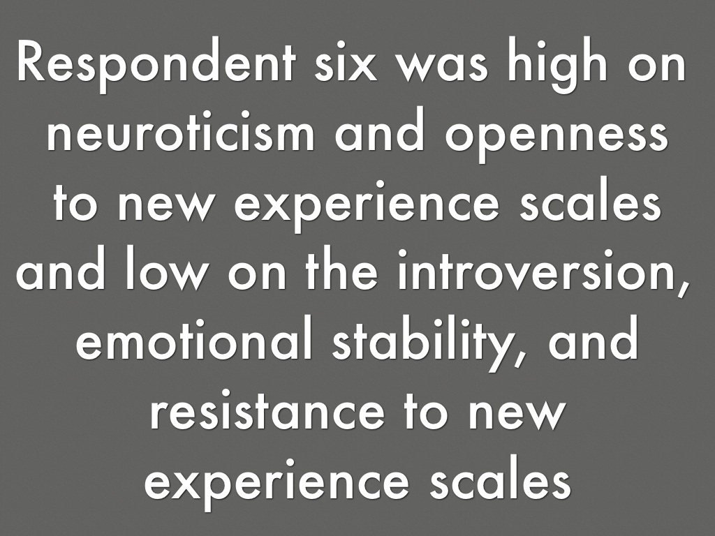 Respondent six was high on neuroticism and openness to new experience scales and low on the introversion, emotional stability, and resistance to new experience scales