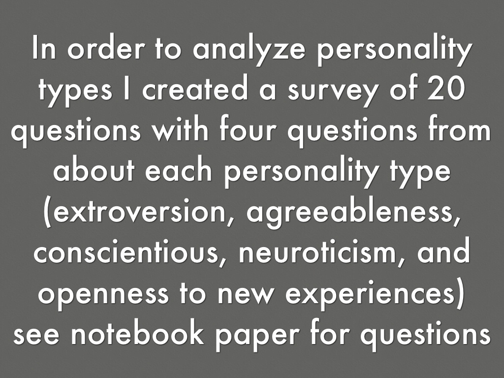 In order to analyze personality types I created a survey of 20 questions with four questions from about each personality type (extroversion, agreeableness, conscientious, neuroticism, and openness to new experiences) see notebook paper for questions
