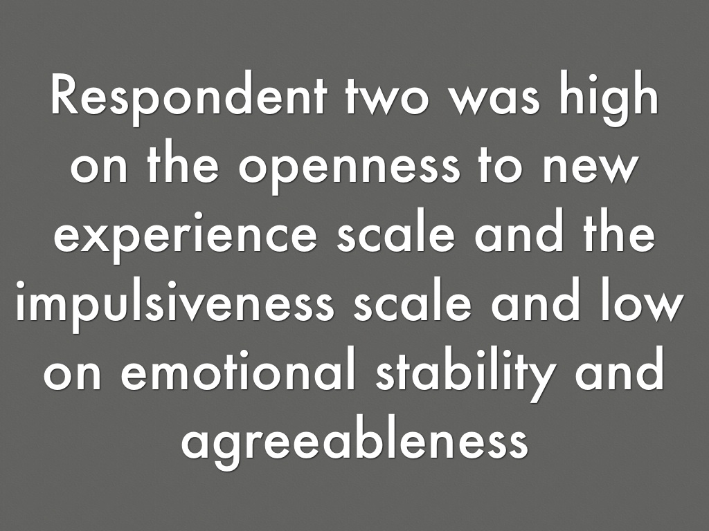Respondent two was high on the openness to new experience scale and the impulsiveness scale and low on emotional stability and agreeableness