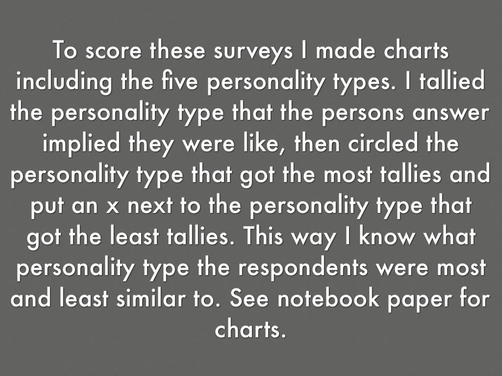 To score these surveys I made charts including the five personality types. I tallied the personality type that the persons answer implied they were like, then circled the personality type that got the most tallies and put an x next to the personality type that got the least tallies. This way I know what personality type the respondents were most and least similar to. See notebook paper for charts.