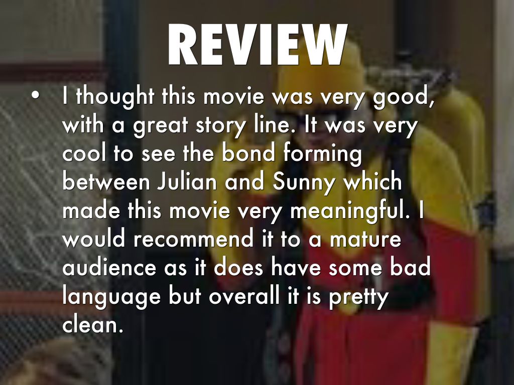 I thought this movie was very good, with a great story line. It was very cool to see the bond forming between Julian and Sunny which made this movie very meaningful. I would recommend it to a mature audience as it does have some bad language but overall it is pretty clean.