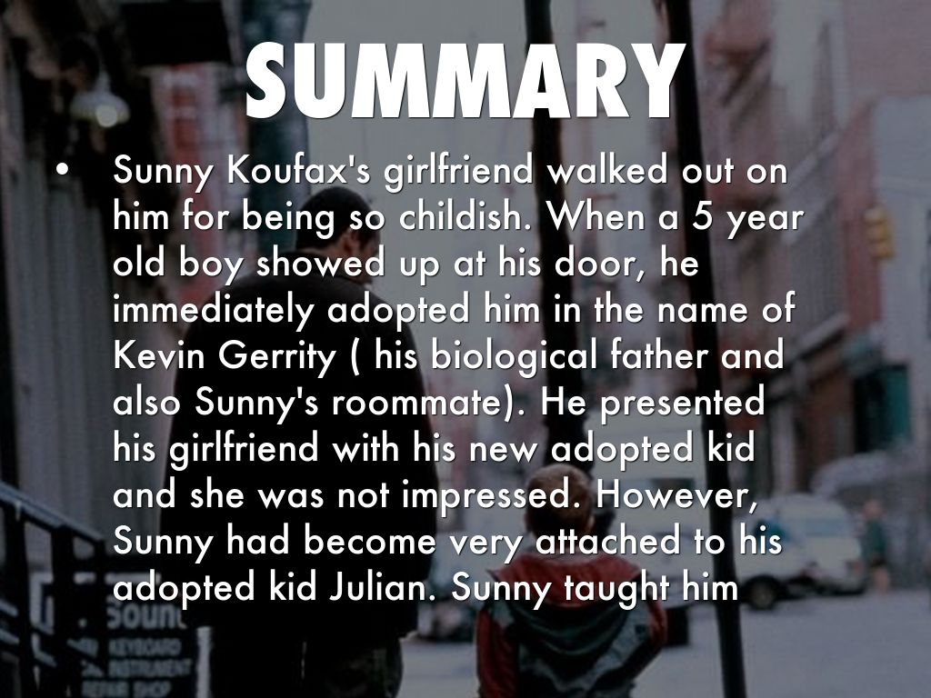 Sunny Koufax's girlfriend walked out on him for being so childish. When a 5 year old boy showed up at his door, he immediately adopted him in the name of Kevin Gerrity ( his biological father and also Sunny's roommate). He presented his girlfriend with his new adopted kid and she was not impressed. However, Sunny had become very attached to his adopted kid Julian. Sunny taught him many new things but most were not a good influence. He started to justify his teachings at the end when Sunny was fighting for the custody of little Julian.