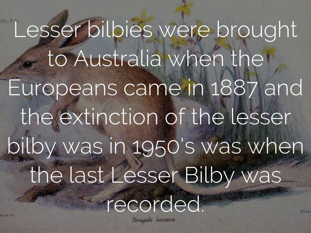 Lesser bilbies were brought to Australia when the Europeans came in 1887 and the extinction of the lesser bilby was in 1950's was when the last Lesser Bilby was recorded.