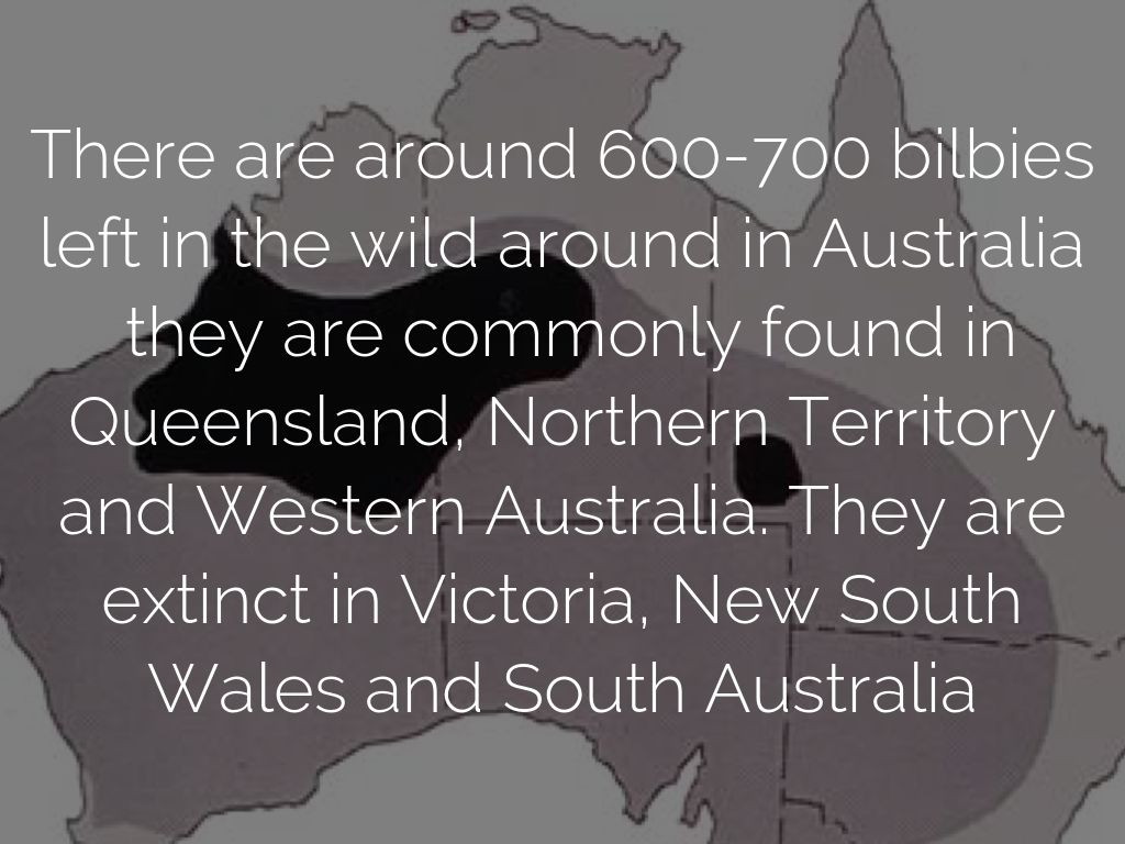 There are around 600-700 bilbies left in the wild around in Australia they are commonly found in Queensland, Northern Territory and Western Australia. They are extinct in Victoria, New South Wales and South Australia