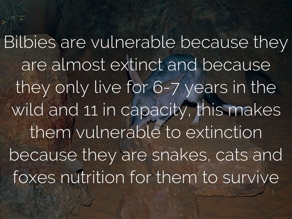 Bilbies are vulnerable because they are almost extinct and because they only live for 6-7 years in the wild and 11 in capacity, this makes them vulnerable to extinction because they are snakes, cats and foxes nutrition for them to survive