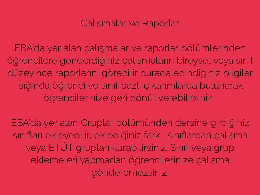 EBA’da yer alan çalışmalar ve raporlar bölümlerinden öğrencilere gönderdiğiniz çalışmaların bireysel veya sınıf düzeyince raporlarını görebilir burada edindiğiniz bilgiler ışığında öğrenci ve sınıf bazlı çıkarımlarda bulunarak öğrencilerinize geri dönüt verebilirsiniz. ​