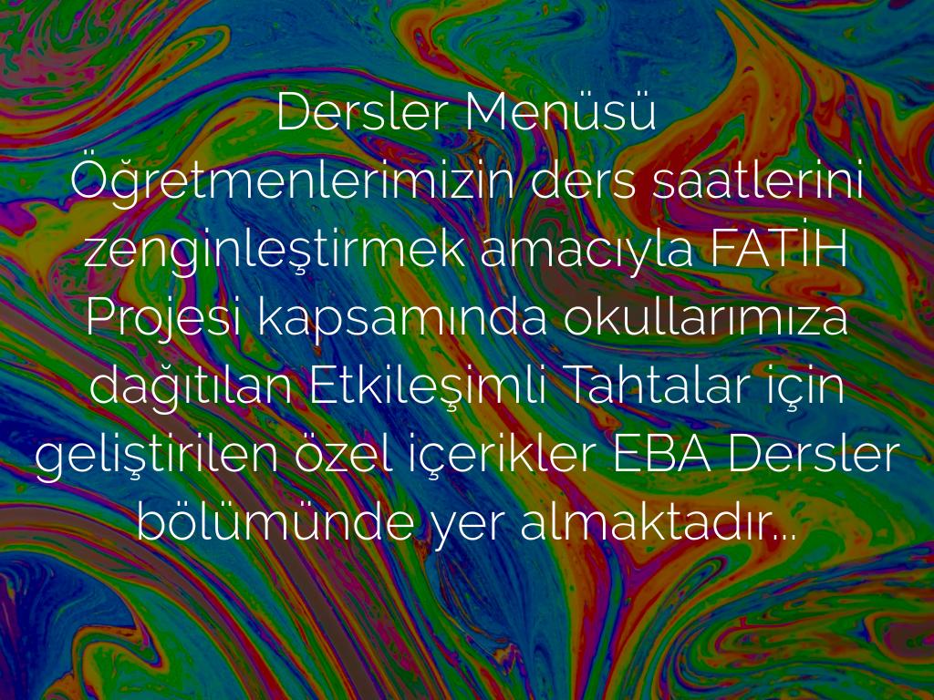 Öğretmenlerimizin ders saatlerini zenginleştirmek amacıyla FATİH Projesi kapsamında okullarımıza dağıtılan Etkileşimli Tahtalar için geliştirilen özel içerikler EBA Dersler bölümünde yer almaktadır...