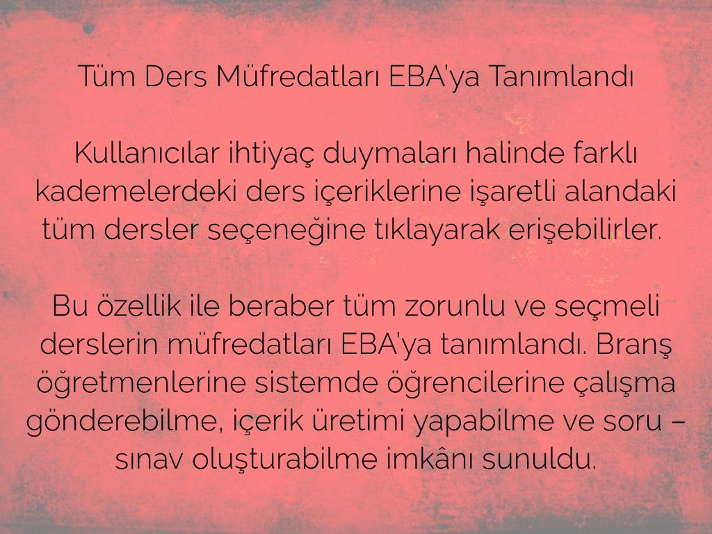 ​Bu özellik ile beraber tüm zorunlu ve seçmeli derslerin müfredatları EBA’ya tanımlandı. Branş öğretmenlerine sistemde öğrencilerine çalışma gönderebilme, içerik üretimi yapabilme ve soru – sınav oluşturabilme imkânı sunuldu.​