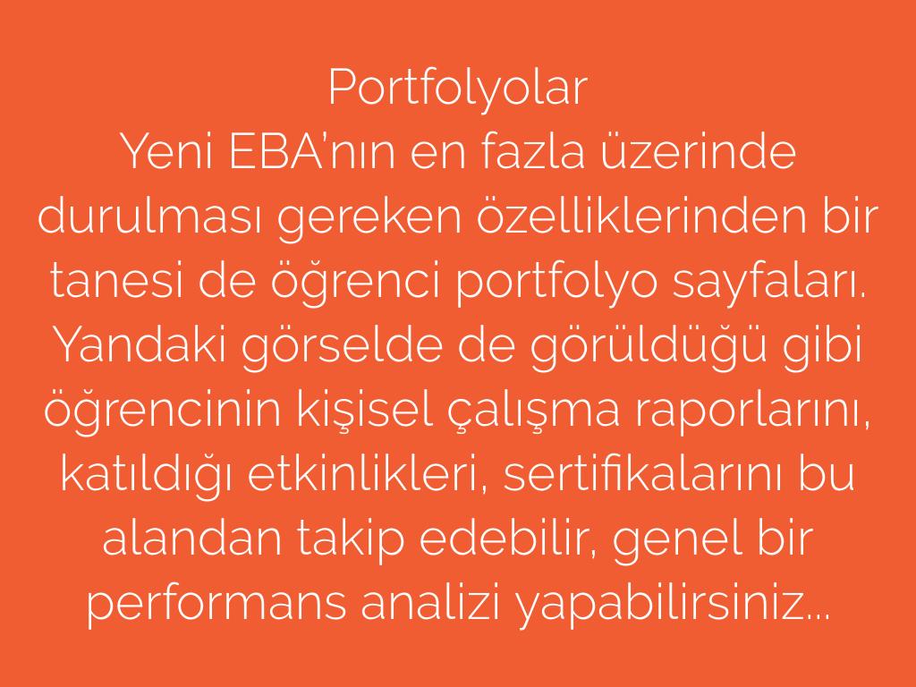 Yeni EBA’nın en fazla üzerinde durulması gereken özelliklerinden bir tanesi de öğrenci portfolyo sayfaları. Yandaki görselde de görüldüğü gibi öğrencinin kişisel çalışma raporlarını, katıldığı etkinlikleri, sertifikalarını bu alandan takip edebilir, genel bir performans analizi yapabilirsiniz...