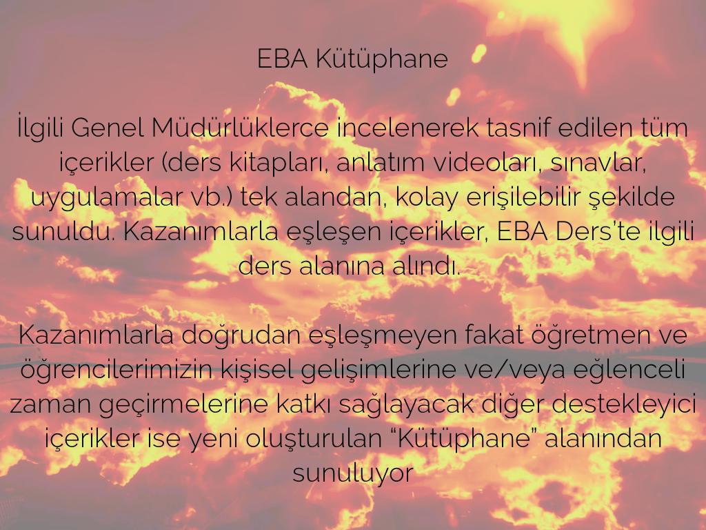 ...Bir önceki EBA versiyonunda yer alan içerik menüsü altındaki kazanımlarla eşleşen videolar, görseller, sesler, kitaplar, infografikler, infovideolar vb. tüm içerikler bu alanda toplandı...