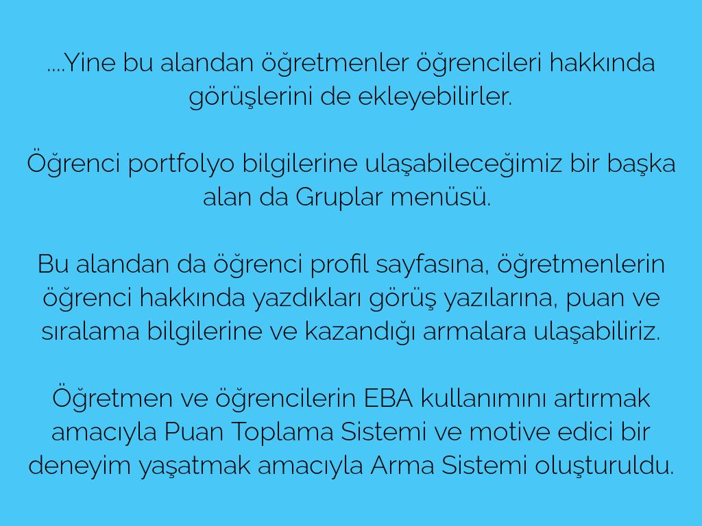 ​Öğretmen ve öğrencilerin EBA kullanımını artırmak amacıyla Puan Toplama Sistemi ve motive edici bir deneyim yaşatmak amacıyla Arma Sistemi oluşturuldu.​