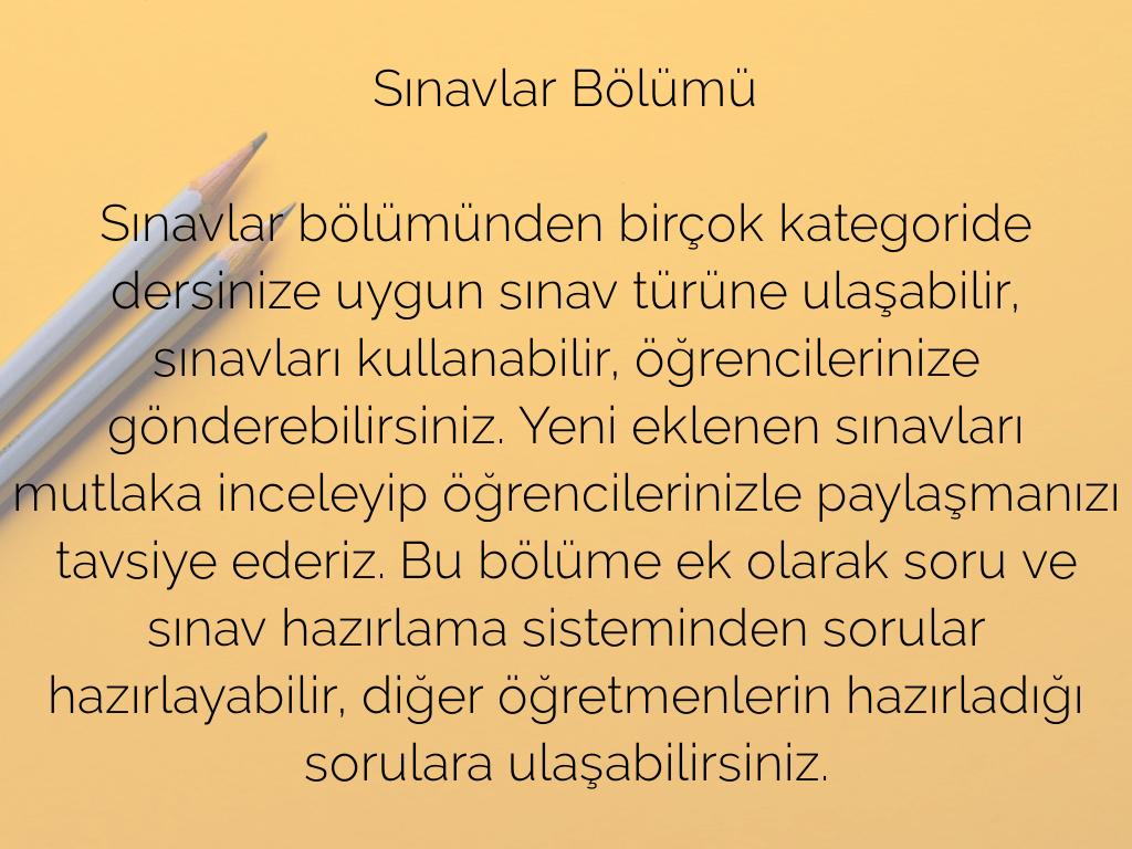Sınavlar bölümünden birçok kategoride dersinize uygun sınav türüne ulaşabilir, sınavları kullanabilir, öğrencilerinize gönderebilirsiniz. Yeni eklenen sınavları mutlaka inceleyip öğrencilerinizle paylaşmanızı tavsiye ederiz. Bu bölüme ek olarak soru ve sınav hazırlama sisteminden sorular hazırlayabilir, diğer öğretmenlerin hazırladığı sorulara ulaşabilirsiniz.​