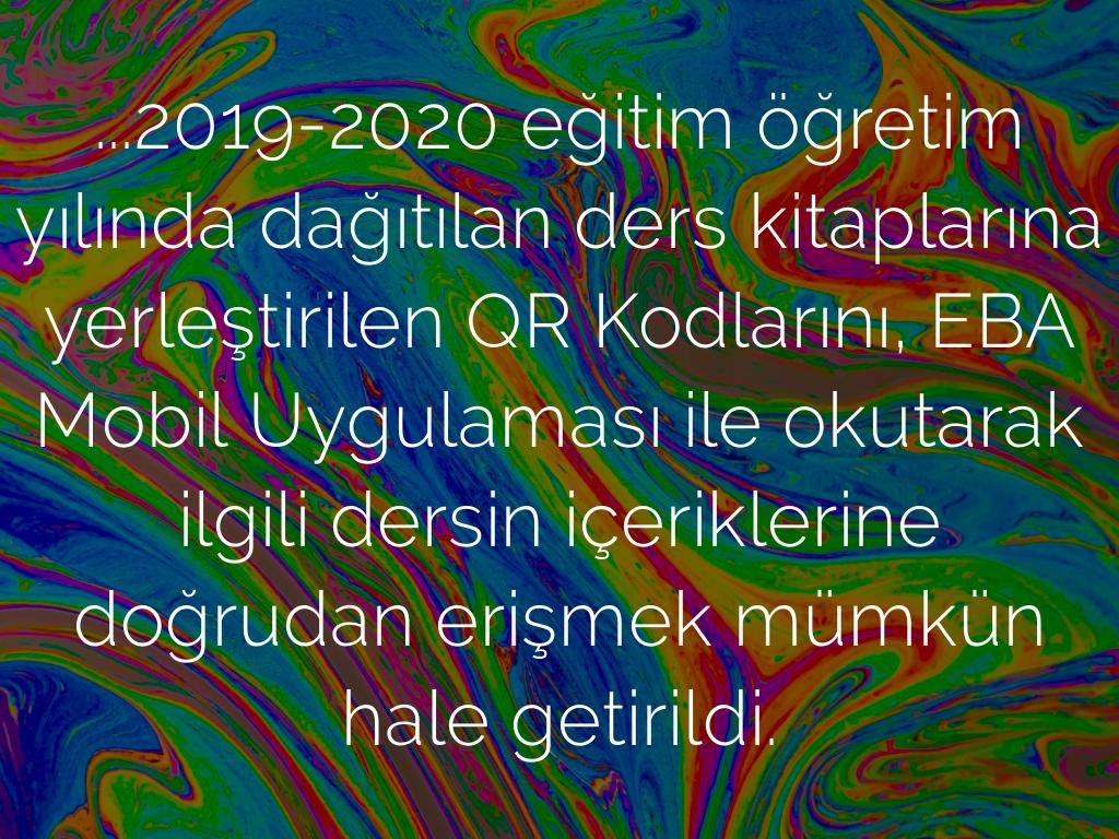 ...2019-2020 eğitim öğretim yılında dağıtılan ders kitaplarına yerleştirilen QR Kodlarını, EBA Mobil Uygulaması ile okutarak ilgili dersin içeriklerine doğrudan erişmek mümkün hale getirildi.​