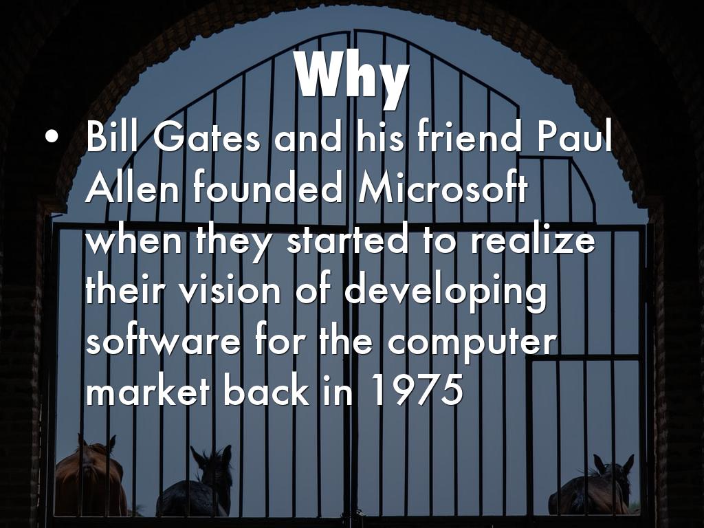 Bill Gates and his friend Paul Allen founded Microsoft when they started to realize their vision of developing software for the computer market back in 1975