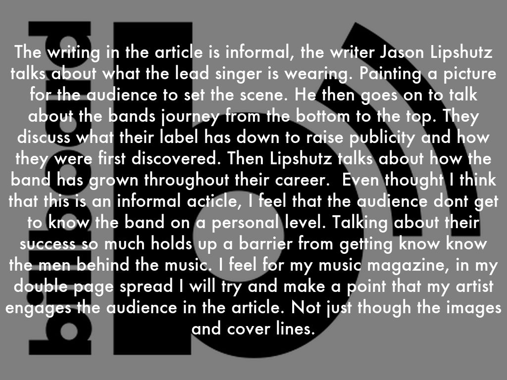 The writing in the article is informal, the writer Jason Lipshutz talks about what the lead singer is wearing. Painting a picture for the audience to set the scene. He then goes on to talk about the bands journey from the bottom to the top. They discuss what their label has down to raise publicity and how they were first discovered. Then Lipshutz talks about how the band has grown throughout their career. Even thought I think that this is an informal acticle, I feel that the audience dont get to know the band on a personal level. Talking about their success so much holds up a barrier from getting know know the men behind the music. I feel for my music magazine, in my double page spread I will try and make a point that my artist engages the audience in the article. Not just though the images and cover lines.