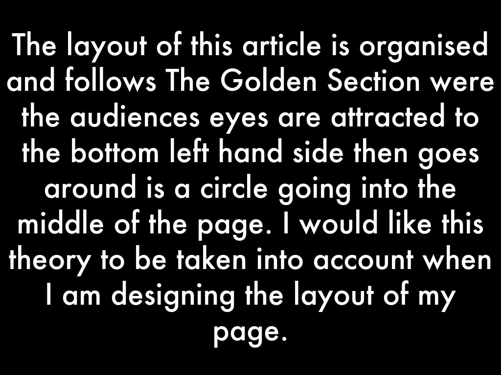 The layout of this article is organised and follows The Golden Section were the audiences eyes are attracted to the bottom left hand side then goes around is a circle going into the middle of the page. I would like this theory to be taken into account when I am designing the layout of my page.