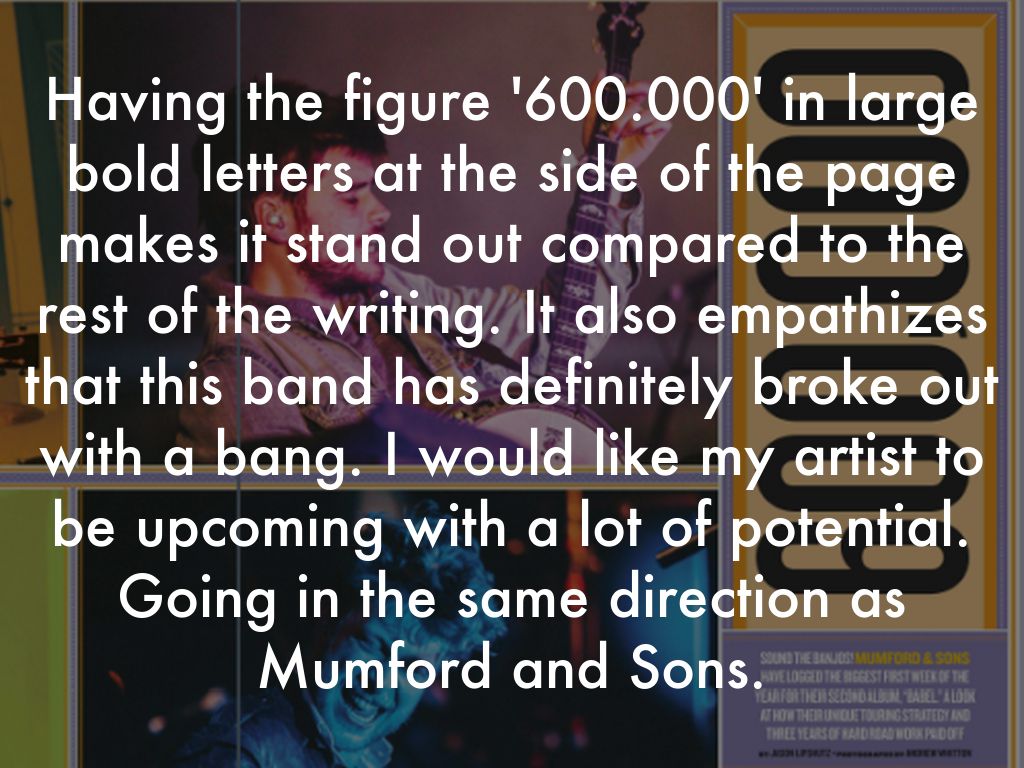 Having the figure '600.000' in large bold letters at the side of the page makes it stand out compared to the rest of the writing. It also empathizes that this band has definitely broke out with a bang. I would like my artist to be upcoming with a lot of potential. Going in the same direction as Mumford and Sons.