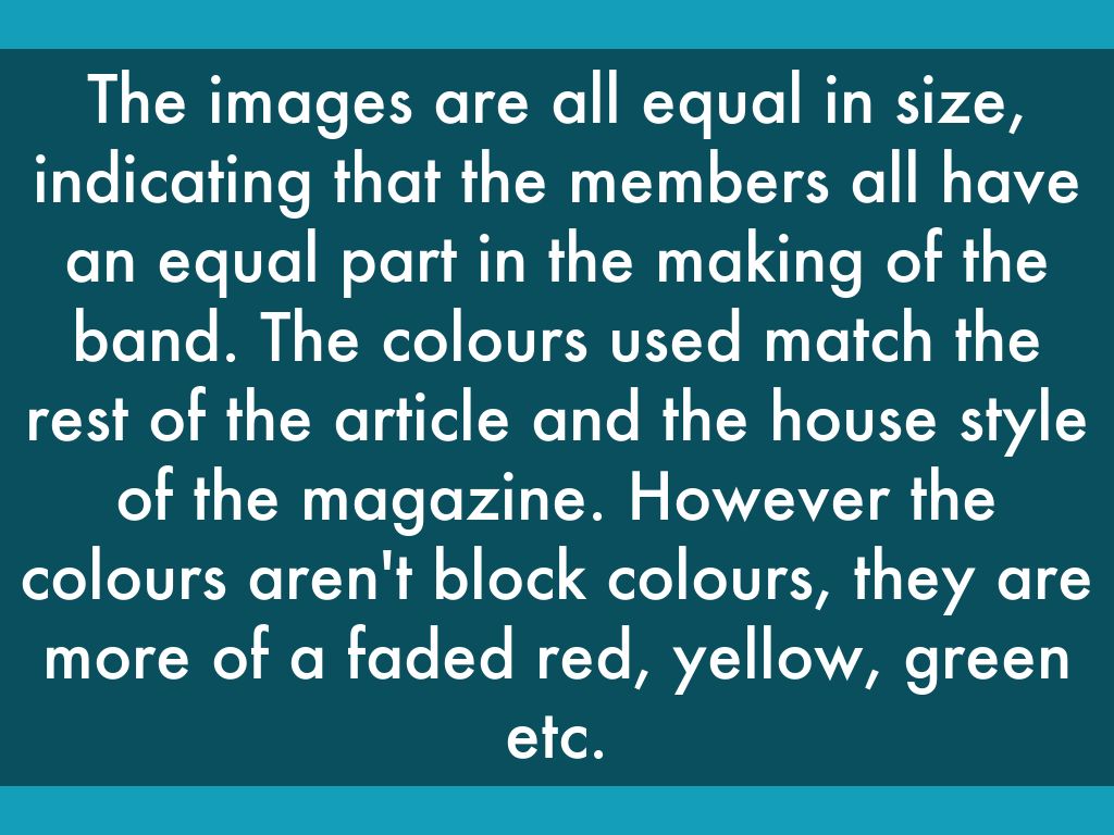 The images are all equal in size, indicating that the members all have an equal part in the making of the band. The colours used match the rest of the article and the house style of the magazine. However the colours aren't block colours, they are more of a faded red, yellow, green etc.
