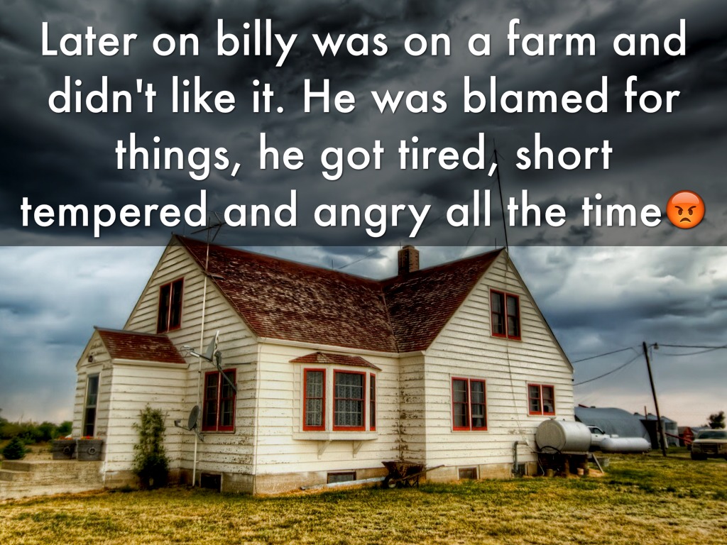 Later on billy was on a farm and didn't like it. He was blamed for things, he got tired, short tempered and angry all the time😡