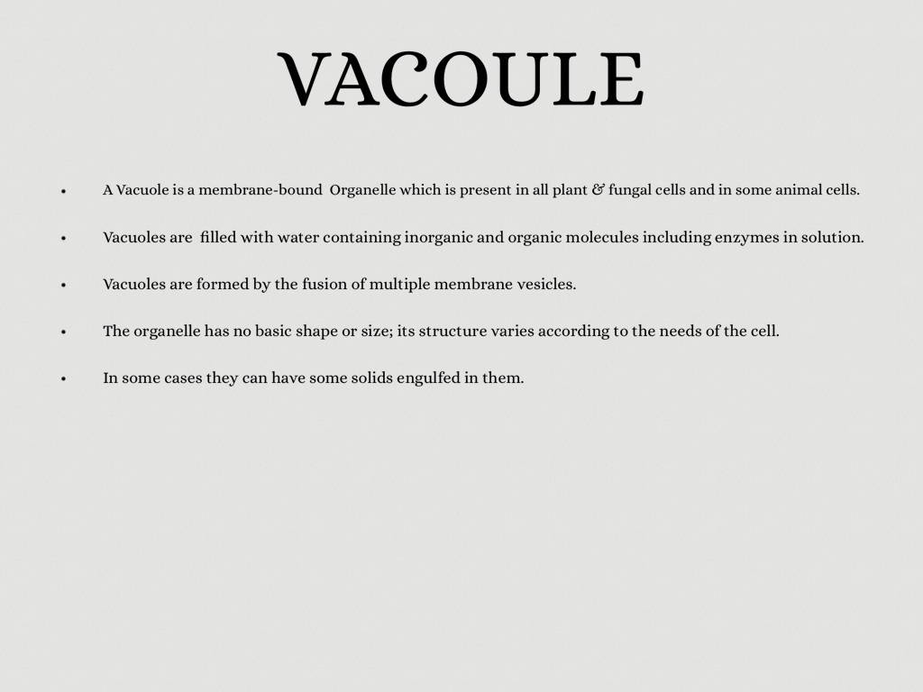 A Vacuole is a membrane-bound Organelle which is present in all plant & fungal cells and in some animal cells.