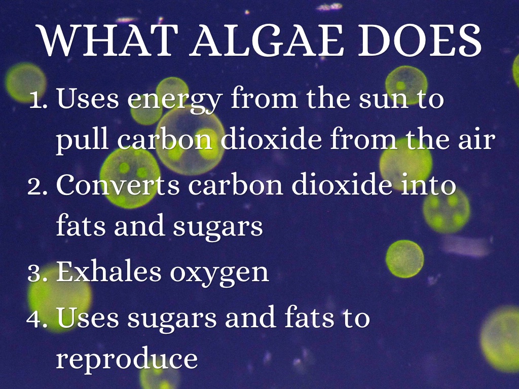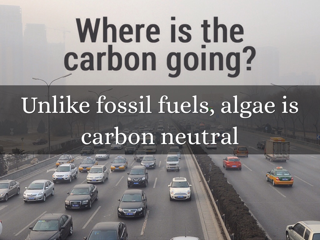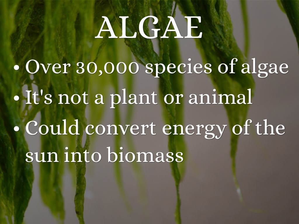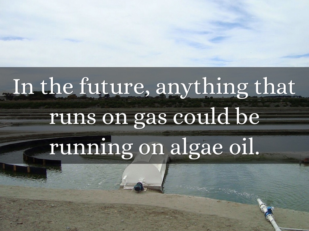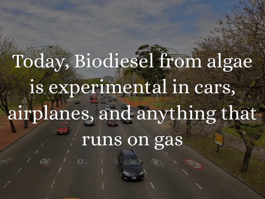 Today, Biodiesel from algae is experimental in cars, airplanes, and anything that runs on gas