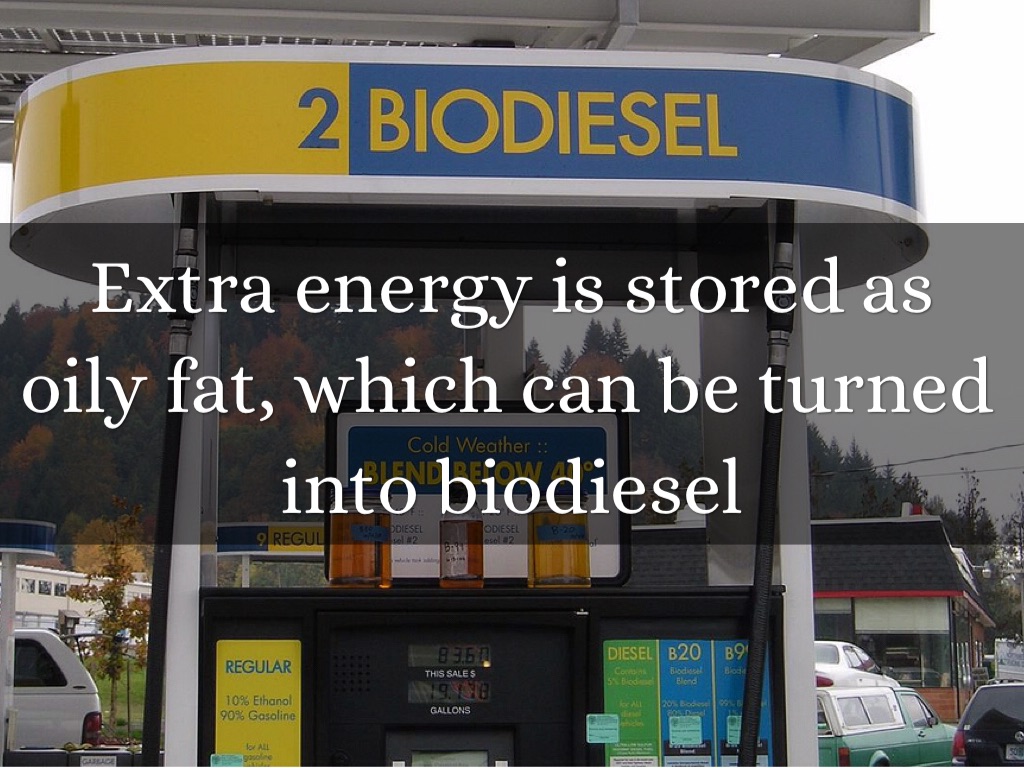 Extra energy is stored as oily fat, which can be turned into biodiesel