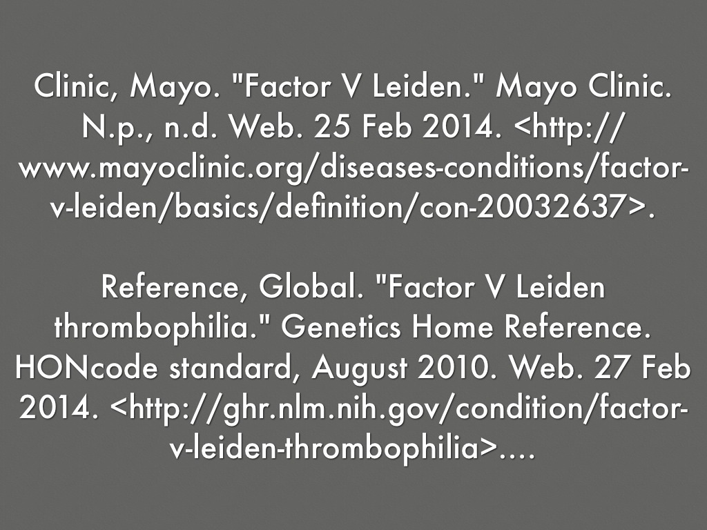 Clinic, Mayo. "Factor V Leiden." Mayo Clinic. N.p., n.d. Web. 25 Feb 2014.