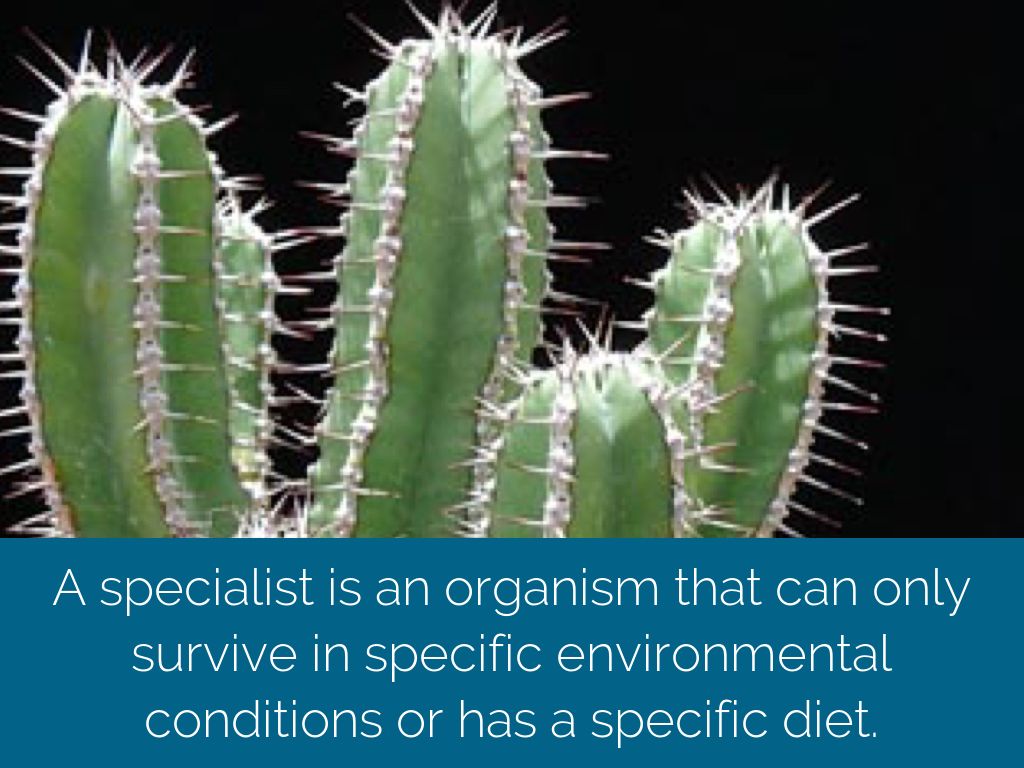 A specialist is an organism that can only survive in specific environmental conditions or has a specific diet.