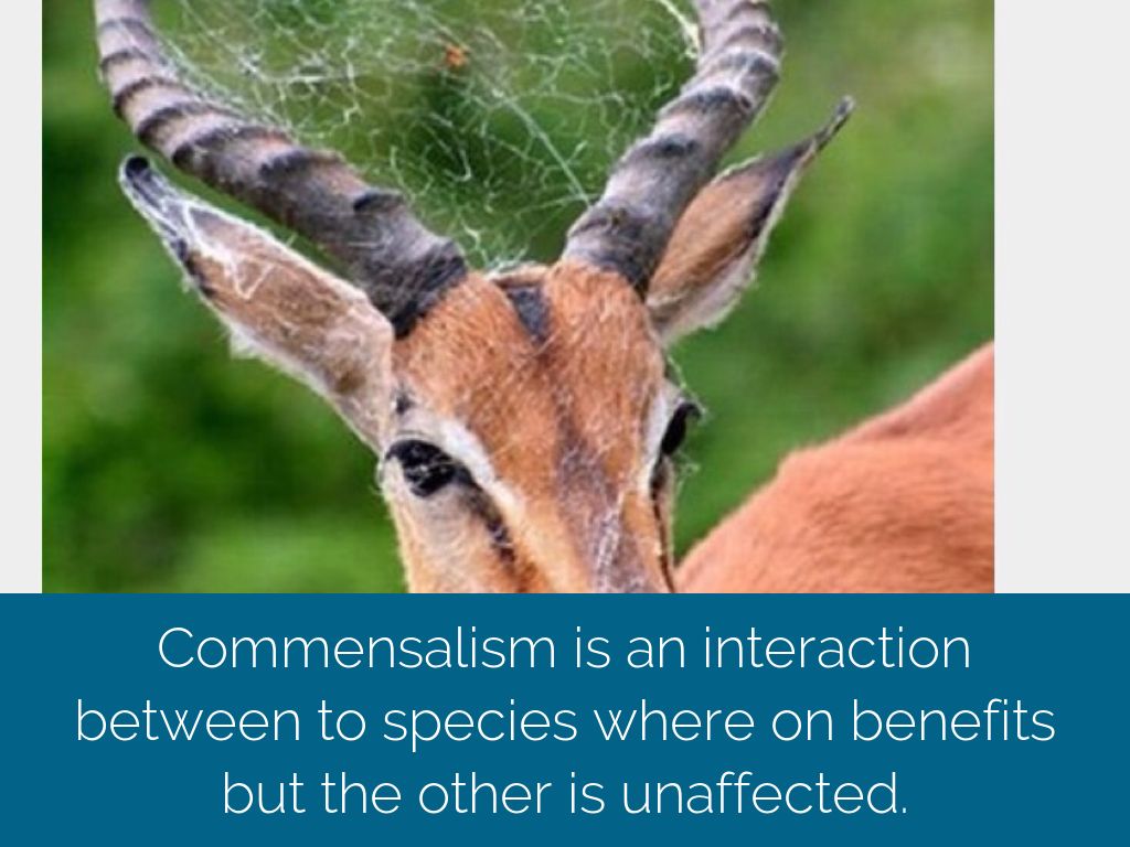 Commensalism is an interaction between to species where on benefits but the other is unaffected.