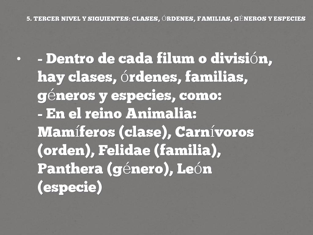 5. Tercer nivel y siguientes: Clases, órdenes, familias, géneros y especies