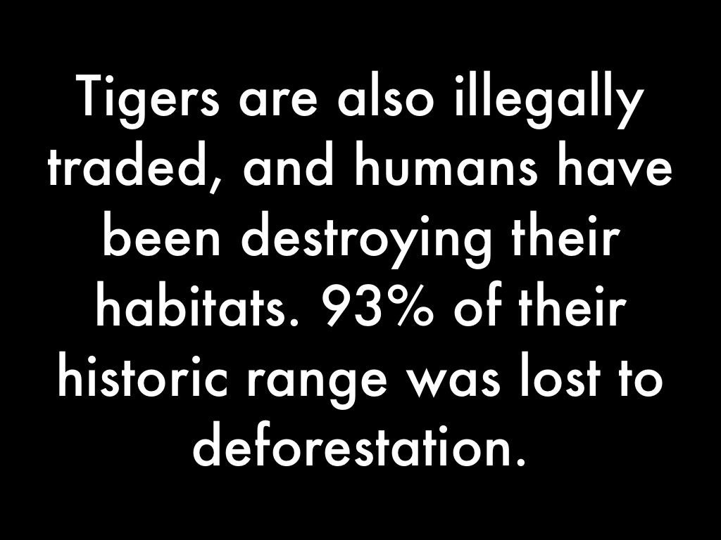 Tigers are also illegally traded, and humans have been destroying their habitats. 93% of their historic range was lost to deforestation.