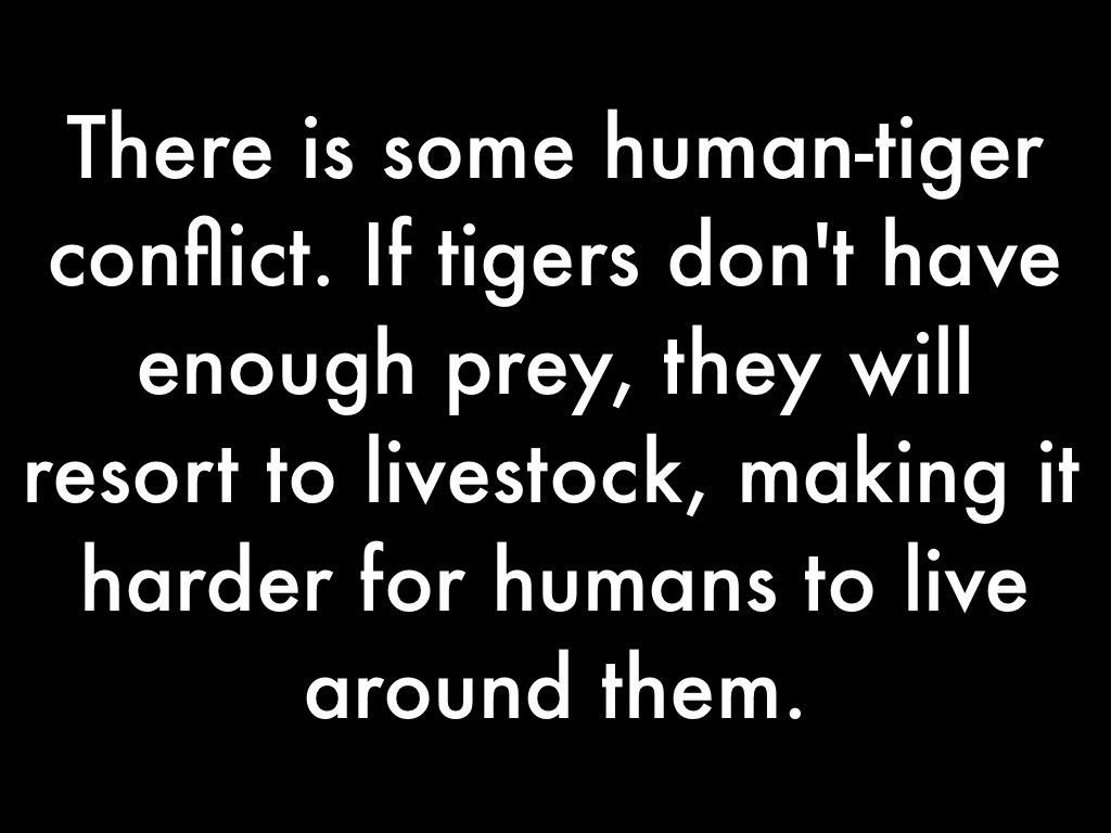 There is some human-tiger conflict. If tigers don't have enough prey, they will resort to livestock, making it harder for humans to live around them.