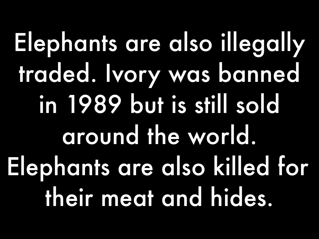 Elephants are also illegally traded. Ivory was banned in 1989 but is still sold around the world. Elephants are also killed for their meat and hides.
