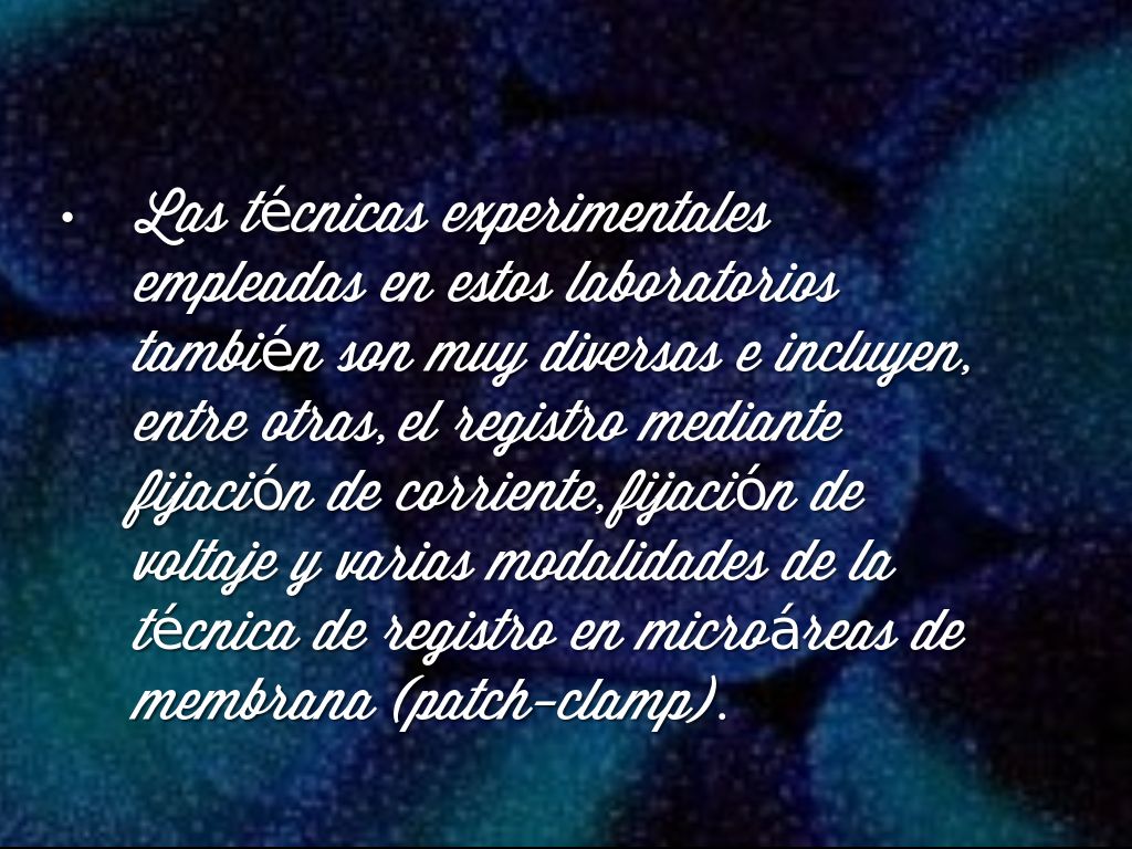 Las técnicas experimentales empleadas en estos laboratorios también son muy diversas e incluyen, entre otras, el registro mediante fijación de corriente, fijación de voltaje y varias modalidades de la técnica de registro en microáreas de membrana (patch-clamp).