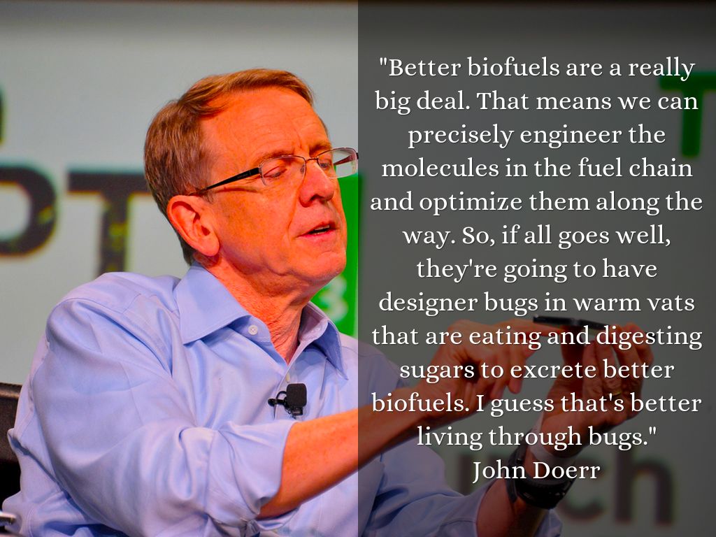 "Better biofuels are a really big deal. That means we can precisely engineer the molecules in the fuel chain and optimize them along the way. So, if all goes well, they're going to have designer bugs in warm vats that are eating and digesting sugars to excrete better biofuels. I guess that's better living through bugs." John Doerr