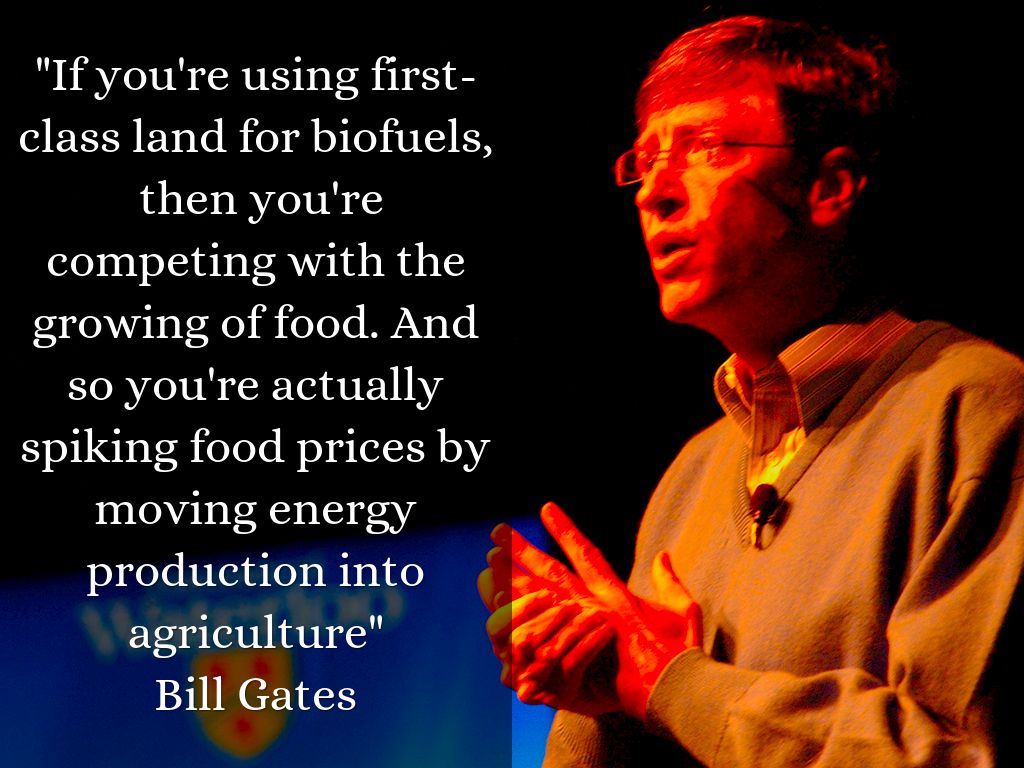 "If you're using first-class land for biofuels, then you're competing with the growing of food. And so you're actually spiking food prices by moving energy production into agriculture" Bill Gates