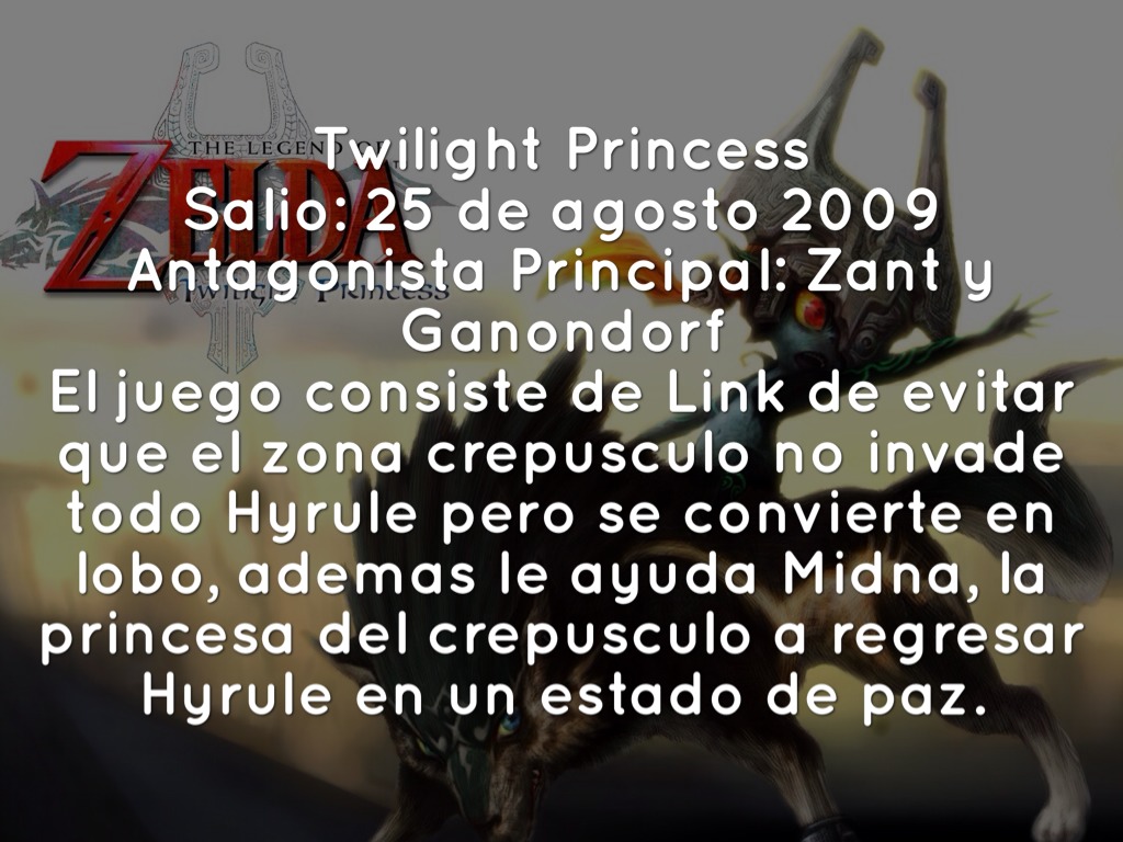 El juego consiste de Link de evitar que el zona crepusculo no invade todo Hyrule pero se convierte en lobo, ademas le ayuda Midna, la princesa del crepusculo a regresar Hyrule en un estado de paz.