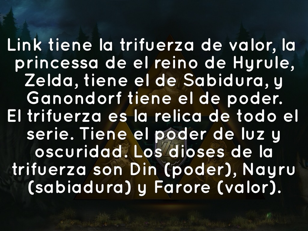 El trifuerza es la relica de todo el serie. Tiene el poder de luz y oscuridad. Los dioses de la trifuerza son Din (poder), Nayru (sabiadura) y Farore (valor).