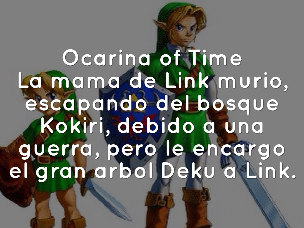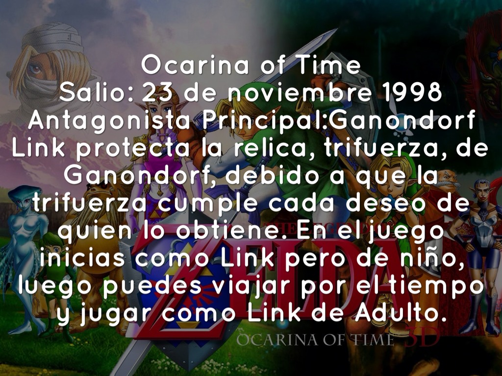 Link protecta la relica, trifuerza, de Ganondorf, debido a que la trifuerza cumple cada deseo de quien lo obtiene. En el juego inicias como Link pero de niño, luego puedes viajar por el tiempo y jugar como Link de Adulto.