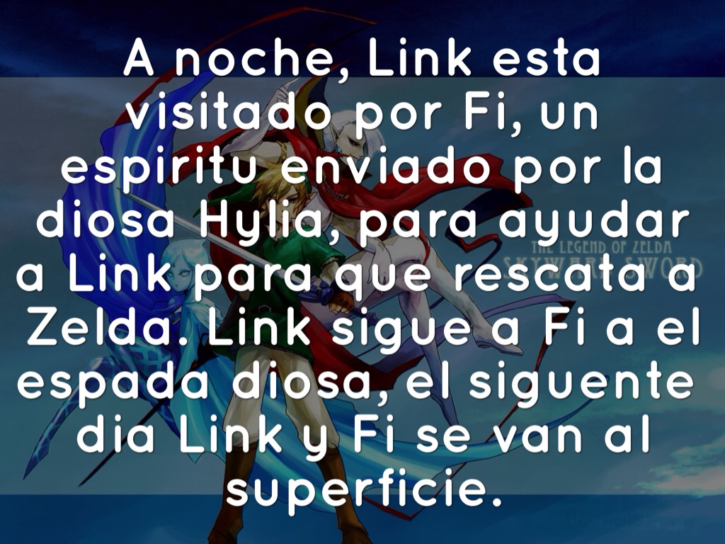 A noche, Link esta visitado por Fi, un espiritu enviado por la diosa Hylia, para ayudar a Link para que rescata a Zelda. Link sigue a Fi a el espada diosa, el siguente dia Link y Fi se van al superficie.