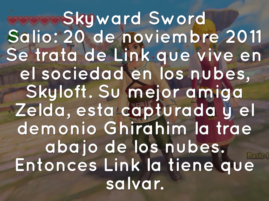Se trata de Link que vive en el sociedad en los nubes, Skyloft. Su mejor amiga Zelda, esta capturada y el demonio Ghirahim la trae abajo de los nubes. Entonces Link la tiene que salvar.