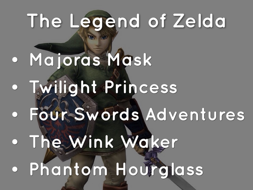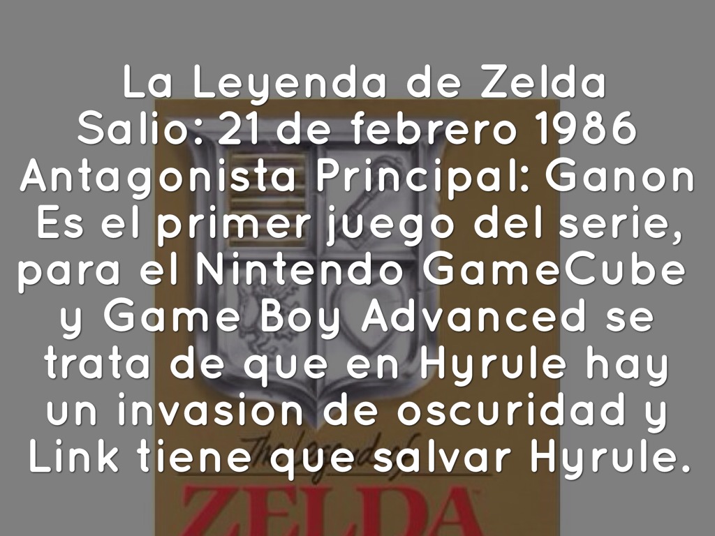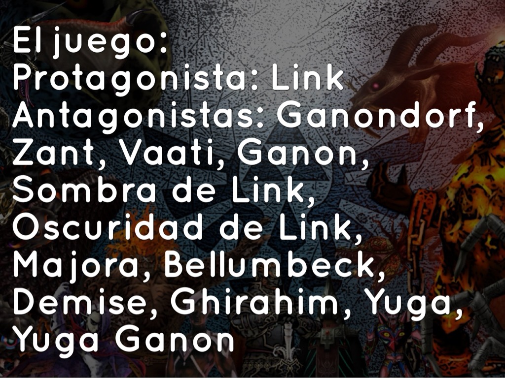 Antagonistas: Ganondorf, Zant, Vaati, Ganon, Sombra de Link, Oscuridad de Link, Majora, Bellumbeck, Demise, Ghirahim, Yuga, Yuga Ganon