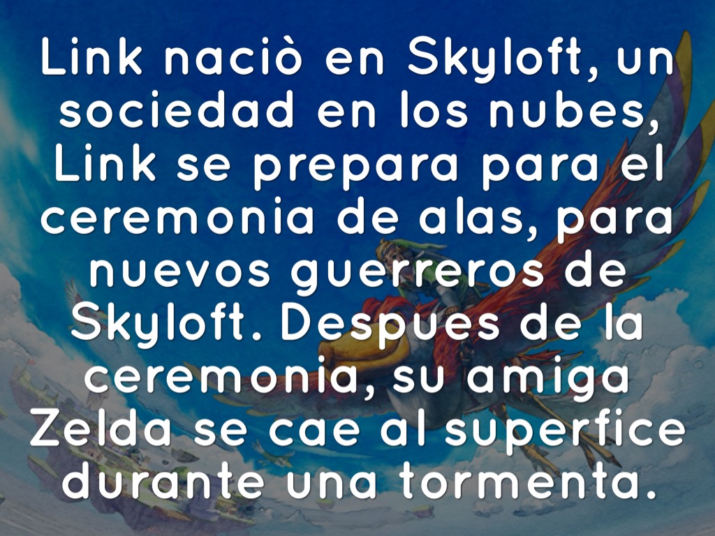 Link naciò en Skyloft, un sociedad en los nubes, Link se prepara para el ceremonia de alas, para nuevos guerreros de Skyloft. Despues de la ceremonia, su amiga Zelda se cae al superfice durante una tormenta.
